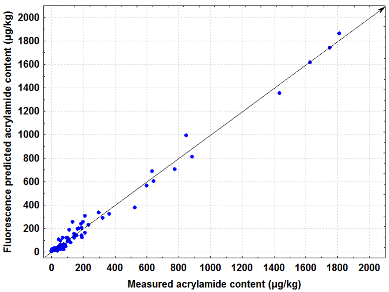 To predict acrylamide from spectra obtained with FLUORALYS ®, a calibration model is developed to link the fluorescence data with acrylamide concentrations measured by the reference technique : LC-MS/MS ( over thirty samples ).