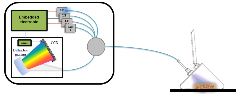 The FLUORALYS® analyzer is composed of a central unit gathering optical and electronic systems on board. Optical fibers and a measure probe send light on the product at different relevant wavelengths and recover the signal transmitted back by the product. The fluorescence spectra obtained reveal the physico-chemical composition of the product.